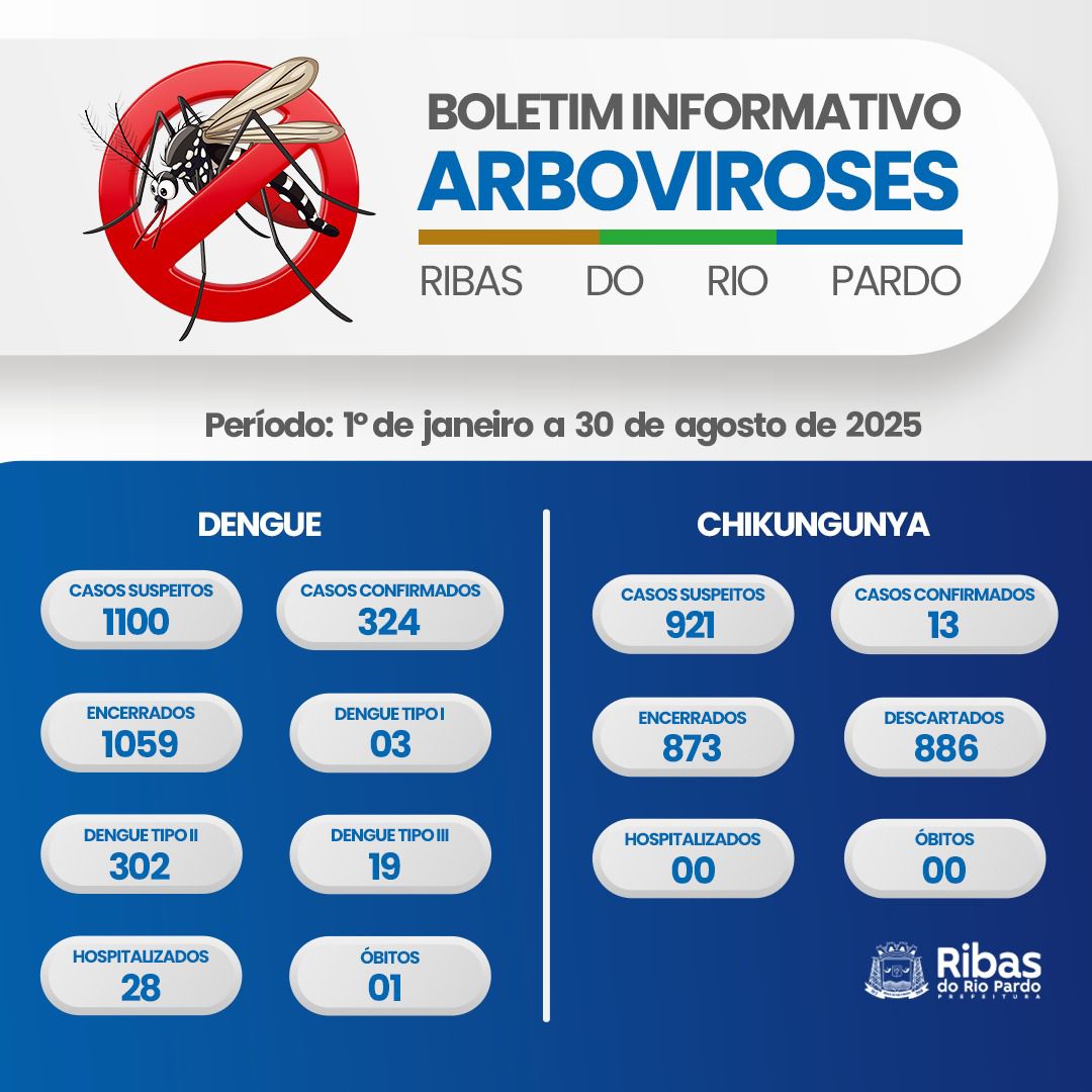 A Secretaria Municipal de Saúde de Ribas do Rio Pardo divulgou, nesta semana, o Boletim Informativo de Arboviroses, referente ao período de 1º de janeiro a 30 de agosto de 2025. O relatório aponta 2.021 notificações de casos suspeitos no município, sendo 1.100 de dengue e 921 de chikungunya.